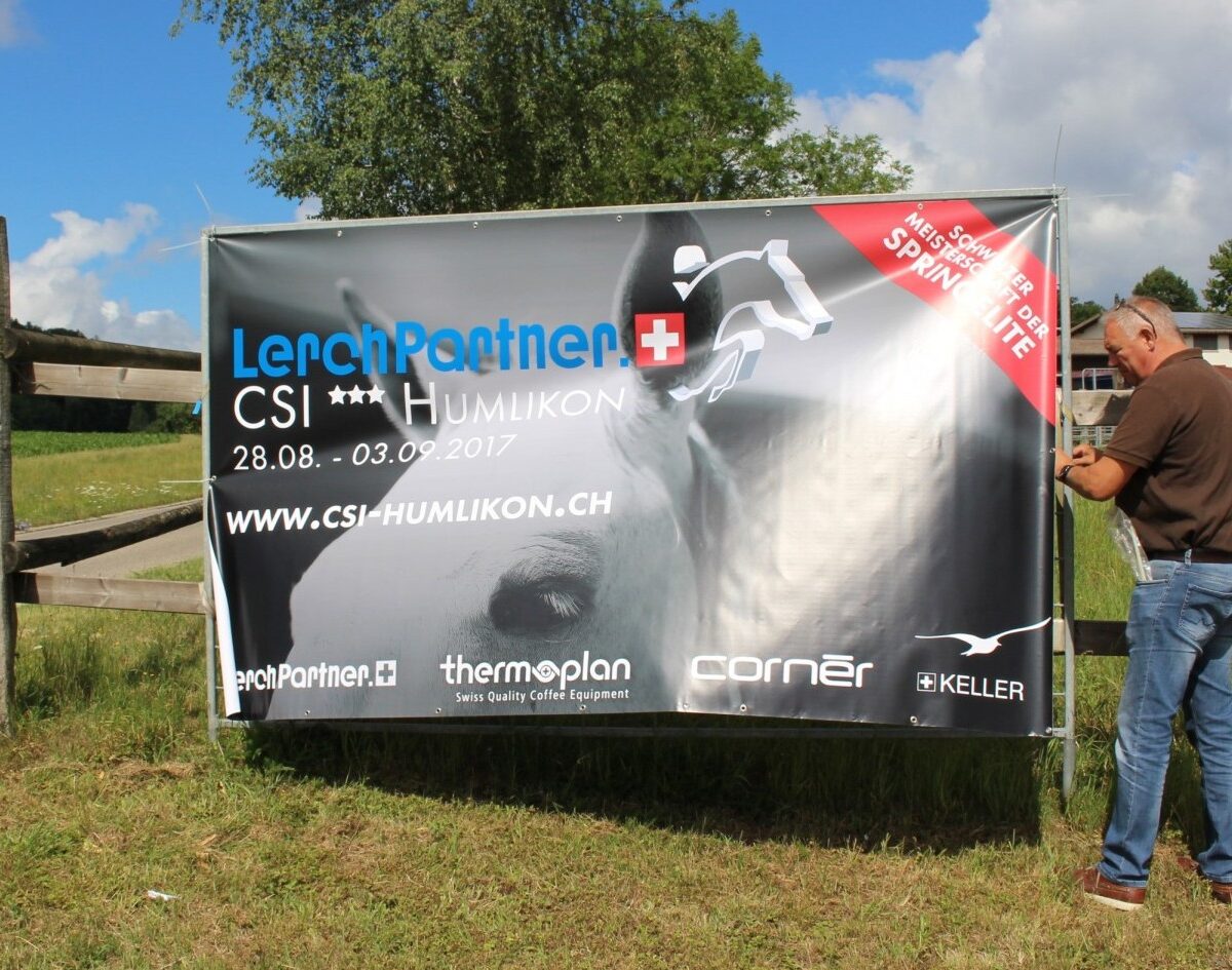 Neuer Titelsponsor, neues Logo, neuer Auftritt – und natürlich auch neue Plakate! Das erste steht an der Zufahrt zum Veranstaltungsort, der Pferdesportanlage Freimüller in Humlikon, an der Ecke Im Gispert/ Flachtaalstrasse – und sie wurde von OK-Co-Präsident Fritz Pfändler gleich selber montiert…..