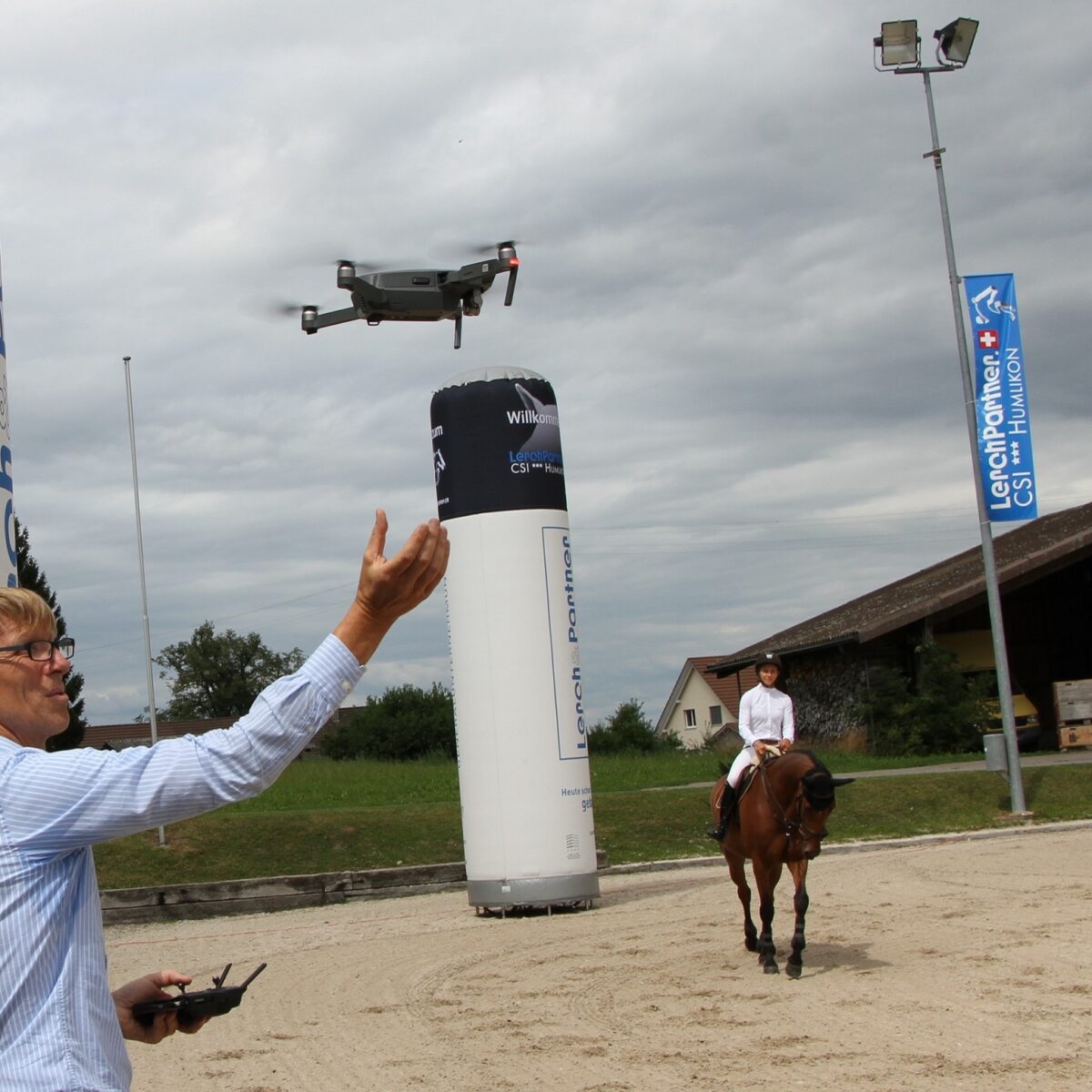 Die Lerch & Partner Generalunternehmung AG, der neue Haupt- und Titelsponsor des LerchPartner.ch CSI Humlikon erstellt Wohnträume – und wirbt dafür u.a. mit TV-Spots auf TeleZüri, TeleZ und TeleTop. In den neuen Spots, die Mitte August auf Sendung gehen, stellt sich die Firma Lerch & Partner auch als neuer Sponsor vor – die Bilder dafür wurden heute auf dem Springplatz in Humlikon gedreht. Bei dem aufwändigen Dreh wurde auch eine Drohne eingesetzt, die nicht nur Luftaufnahmen vom Turnierplatz machte sondern auch Bilder aus der Vogelperspektive aufnahm, als Melanie Freimüller mit Viva la Vida über den LerchPartner.ch-Sprung setzte. Die erst 8-jährige Stute verhielt sich dabei wie ein Superstar und zeigte sich von dem fliegenden Objekt, das um ihren Kopf schwirrte kaum beeindruckt! Ebenso professionell stellten sich Ulrich Koller, Geschäftsführer der Lerch & Partner Generalunternehmung AG, und Paul Freimüller, OK-Präsident des LerchPartner.ch CSI Humlikon, im Interview den Fragen von Moderatorin Deborah Kiener. Wir sind gespannt auf die fertigen Spots!