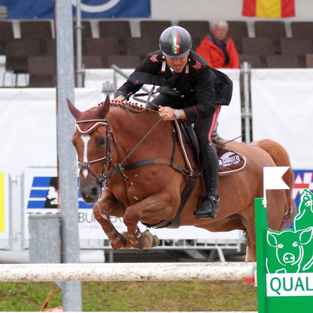 Bruno Chimirri mit Rock Star de Boisy, der Sieger im Preis von Irene & Felix Huber, Humlikon ZH, reitet in der schicken schwarzen Uniform mit roten Streifen der italienischen Carabinieri. Der Schnellste in diesem Dreisterne-Springen (mittlere Tour) salutierte stramm während die italienische Nationalhymne bei der Siegerehrung gespielt wurde. Dann erwies er sich als Gentleman und überreichte seinen Sieger-Blumenstrauss der zweitplatzierten Amerikanerin Olivia Chowdry, die Cosma geritten hatte. Mit Rang 3 gelang Manuel Eugster erneut eine Top-Klassierung mit Paul Büchelers Callisto. Vierter wurde der Sieger des gestrigen Weltranglistenspringens, Robert Vos, diesmal mit Darius, vor Pius Schwizer mit About a Dream.