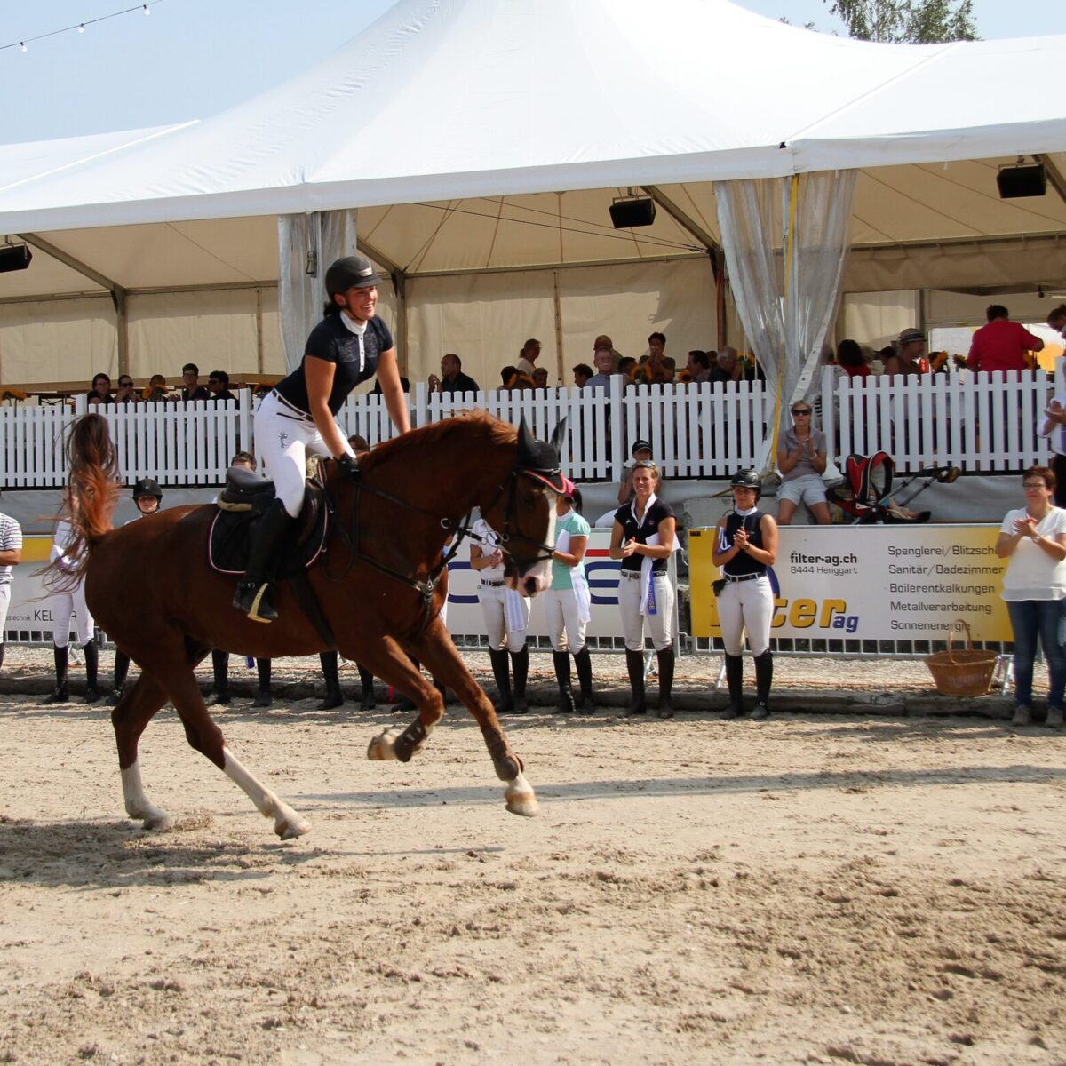 Die Siegerin im Preis der Scherrer Gebäudehüllen AG, Henggart, heisst Tina Müller. Die Amazone aus Affeltrangen erzielte mit dem 15-jährigen Fuchswallch Valido III CH in dem progressiven Punktespringen die maximale Anzahl an Punkten (65) in der weitaus schnellsten Zeit von 55,63 Sekunden. Der zweitplatzierte Grégory Roulin aus Stadel b. Niederglatt benötigte mit Condor XVIII 3.75 Sekunden länger. Auf dem guten 3. Rang klassierte sich Denise Kubli aus Kloten mit Käthi Peyer-Altorfers 11-jährigen Stute Cismet.