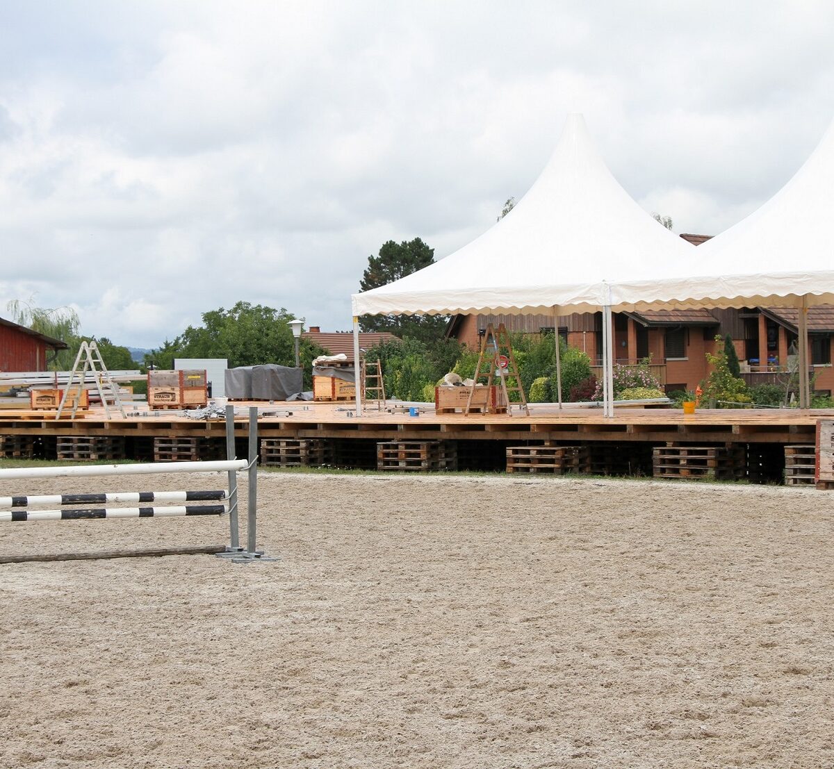 Ausser dem Sandplatz, der zur Pferdesportanlage der Familie Freimüller gehört, ist die gesamte Infrastruktur des LerchPartner.ch CSI Humlikon temporär – das heisst, sie muss im Vorfeld in wochenlanger Arbeit aufgestellt und nach dem Turnier wieder zurückgebaut werden. „Wir haben mittlerweile Routine darin und sind ein eingespieltes Team“, sagt Fritz Pfändler, Co-OK-Präsident der Veranstaltung. Von grösseren Rückschlägen wie im vergangenen Jahr, als eine Sturmböe das grosse Festzelt weggeweht und beschädigt hat, ist man verschont geblieben. Doch auch in diesem Jahr stellte das Wetter die Arbeiter und Helfer bei den Aufbauarbeiten wieder vor Herausforderungen, mit zeitweise Temperaturen über 35 Grad oder dann wieder heftigen Regenfällen. „Trotzdem kommen wir mit den Arbeiten gut voran und liegen gut im Zeitplan“, erklärt Fritz Pfändler. Wenn der 15. CSI Humlikon am Montag, 26. August beginnt, wird jedes Brett, jede Schraube, jedes Blümchen an seinem Platz sein – und die Teilnehmer werden optimale Bedingungen und die Zuschauer ein einzigartiges Ambiente vorfinden.