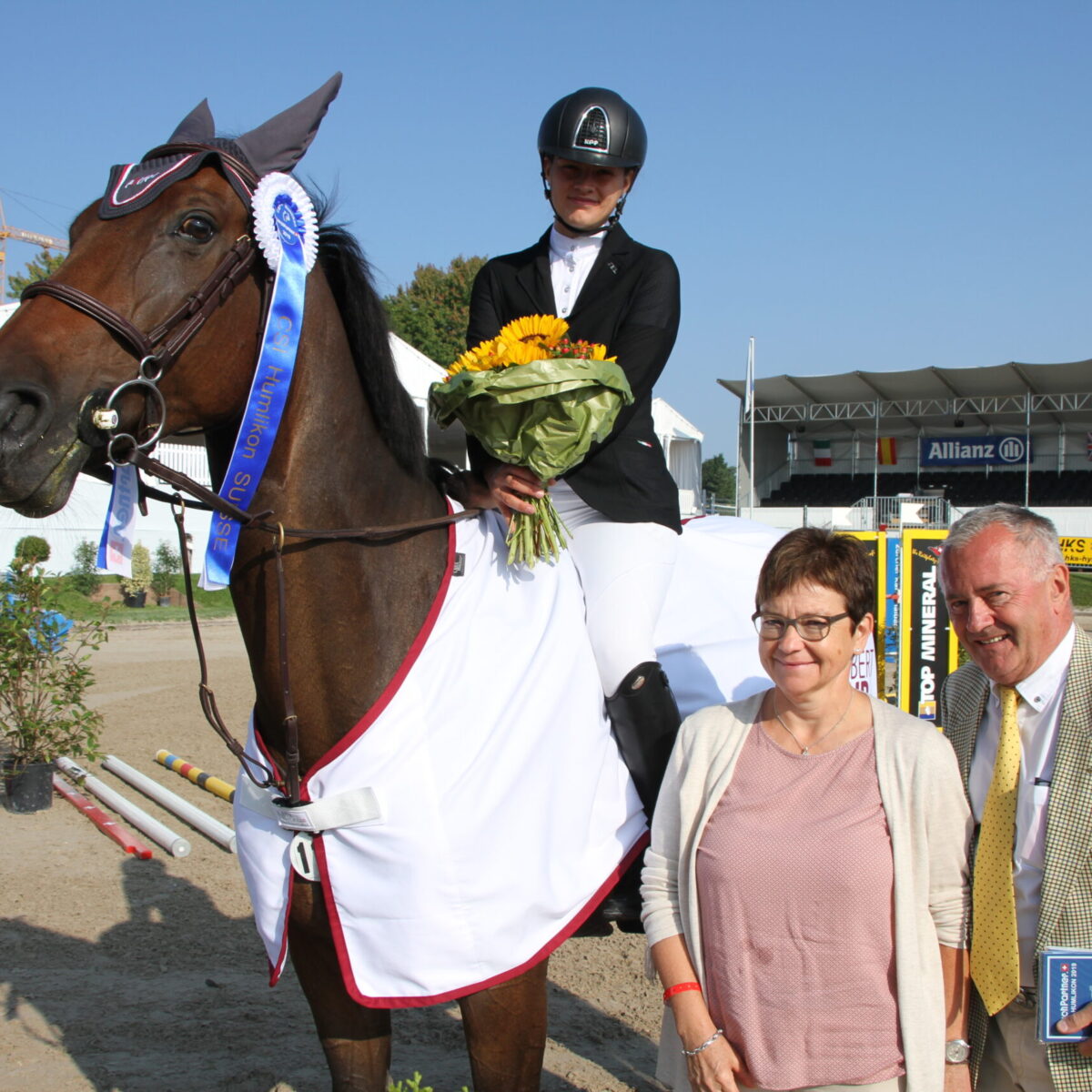 Ihre Geduld mit E Borussia zahlt sich nun aus für Iris Gautschi. Sie hat die KWPN-Stute, seit sie siebenjährig ist. „Aber brauchte ein bisschen länger, sie war sehr heiss am Anfang.“ Seit diesem Jahr aber sei der Knopf aufgegangen und es läuft mit der mittlerweile Zehnjährigen. Heute gewinnt das Paar den Tinka’s Boy Preis, ein Einstern-Springen der Mittleren Tour über 1.30 Meter. Mit ihrem zweiten Pferd Hayden klassierte sich iris Gautschi auch gleich noch im dritten Rang hinter Andrea Ott mit Oklahoma. Den Erfolg der Familie Gautschi komplementierte Eva Gautschi auf Rang 7. Ihr Pferd Stakkate durfte mit Iris Gautschi an die Siegerehrung.