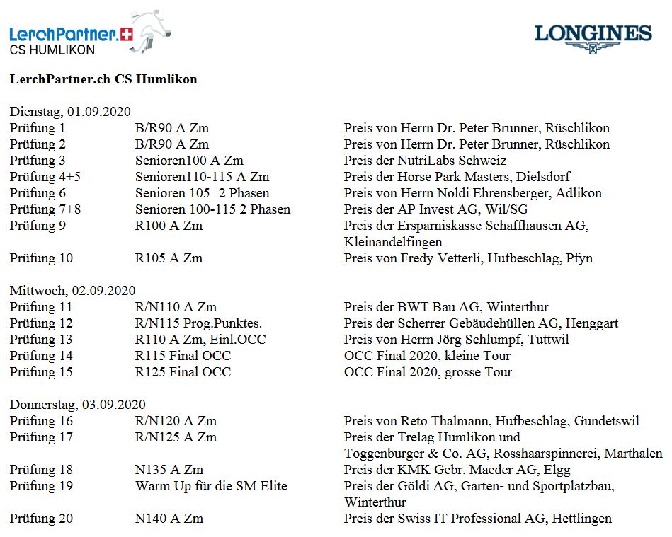 Der Zeitplan ist online! Klicken Sie auf dieser Webseite auf die Rubrik Zeitplan und Sie erhalten eine Übersicht über die aktuellen Tagesplänen mit den Anfangszeiten der rund 30 Springprüfungen am LerchPartner.ch CS Humlikon 2020. Ausserdem finden Sie oberhalb an der Übersicht ein praktisches PDF mit der Übersicht über die ganze Woche zum Download.