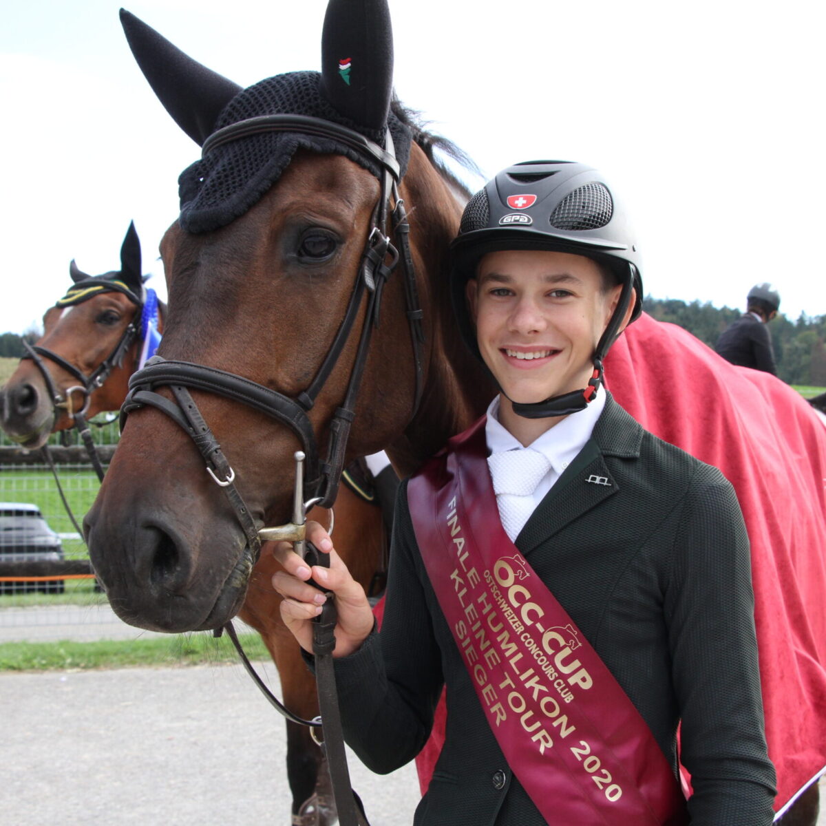 Mit der Grossmutter For me v. Wichenstein gewann Linus Hanselmann in diesem Jahr SM-Bronze bei den Junioren, mit deren 7-jährigen Enkel Dorado v. Wichenstein CH gelang ihm heute beim kleinen Final des OCC-Cup ein Start-Ziel-Sieg. Er war als Start-Nr. 1 zu dem Springen mit Stechen angetreten – und war am Schluss auch bei der Siegerehrung noch der Erste. „Besonders Freude macht mir, dass ich diesen Final mit so einem jungen Pferd gewinnen konnte“, meinte der 16-jährige, der den braunen Wallach auch selber ausgebildet hat. Auch gezogen wurde das Pferd, wie schon seine Mutter und Grossmutter auf dem Gestüt Wichenstein in Oberriet. Nur gerade 5 Hundertstel langsamer und ebenfalls fehlerlos in dem Stechen, für das sich 16 Paar qualifiziert hatten, war Melanie Schmid aus Beringen mit dem 9-jährigen Calgary Il D’Argilla Z. Sie belegte den zweiten Podestplatz vor der Wallisellerin Corina Sorg mit der immer konstanter springenden Zangersheide-Stute Elinde Z.
