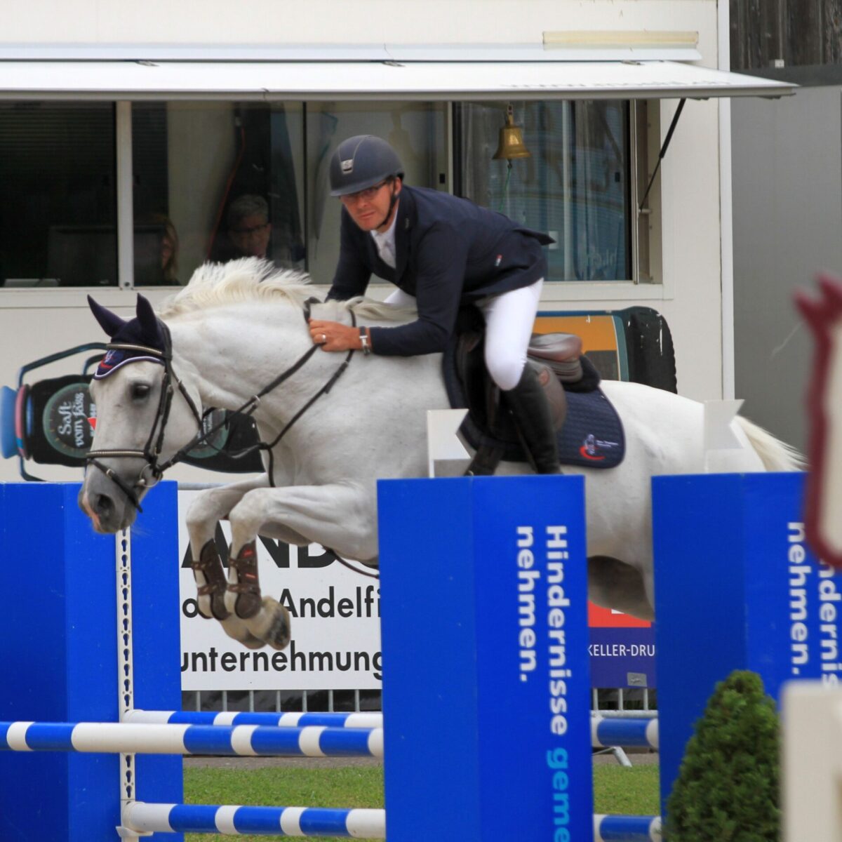 Der Prüfungssponsor im Preis von Reto Thalmann, Hufbeschlag, Gundetswil, ist gleichzeitig auch der Sieger in dieser Einlaufprüfung für den OCC-Cup in zwei Stufen. Der CSI-Hufschmied, der gestern schon im R/N100 einen Doppelsieg feiern durfte, war im Sattel der  Schimmelstute Sateen auch heute am schnellsten fehlerfrei. Es sei ihm „fast schon ein bisschen peinlich“ seine eigene Prüfung zu gewinnen, sagte der Reto Thalmann, der den Siegerpreis aus den Händen seiner Frau entgegen nehmen durfte. Gleichzeitig freute er sich über die positive Entwicklung seiner Franzosenstute, die „nicht immer die einfachste“ gewesen sei.