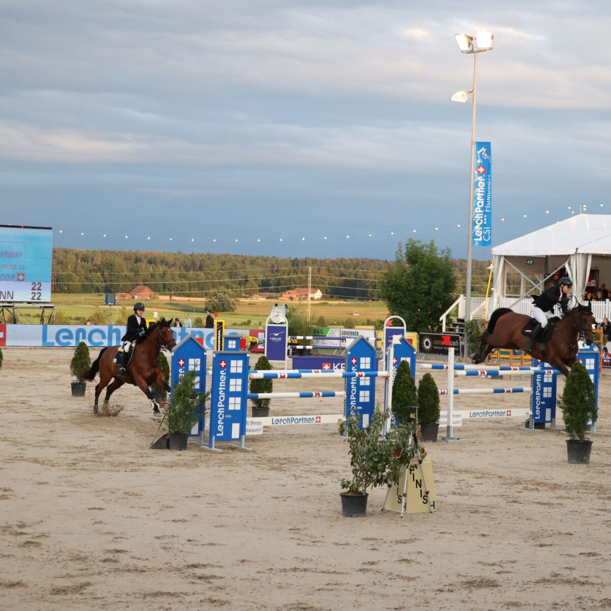 Es war an Spannung wieder einmal fast nicht auszuhalten, das beliebte LerchPartner.ch Knock Out. Bei allerschönster Abendämmerung kämpften sich 16 Paar durch das Tableau. Angefeuert von der Seite „Festwirtschaft“ und der Seite „Tribüne“ arbeiten sich die Reiterinnen und Reiter im „Knock out“-Verfahren über das Viertel- und das Halbfinale vor – wer seine Runde verlor, war draussen.