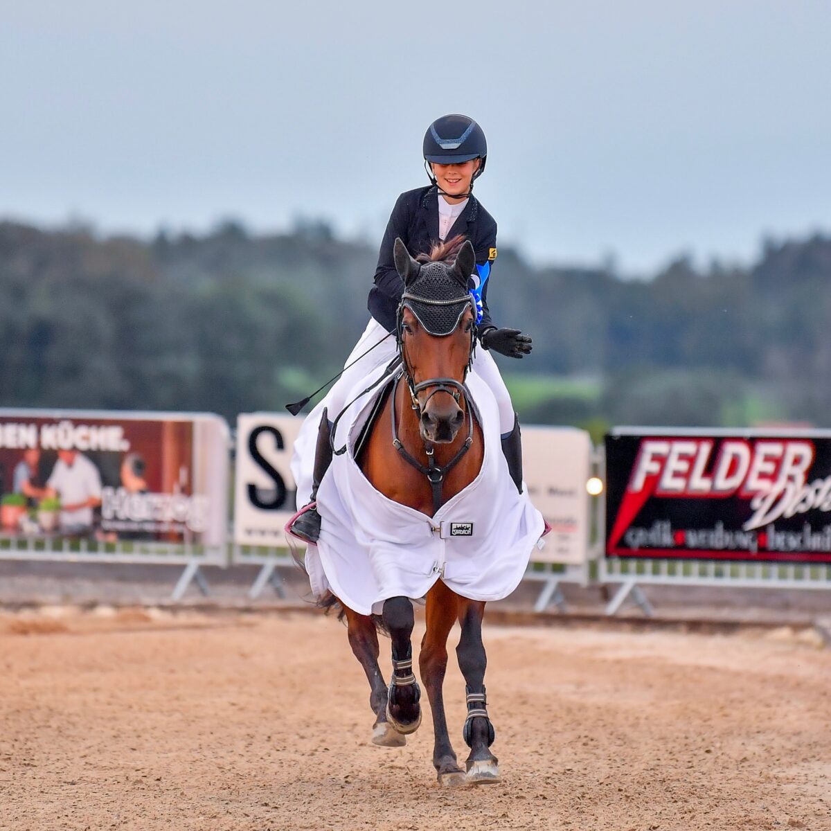 Sie war eine der Jüngsten im Starterfeld – und die Schnellste: Die 11-jährige Sara Luginbühl aus Winterberg gewinnt mit der Ponystute Rea des Perves, die mit 18 Jahren um einiges älter ist als ihre Reiterin, den Preis der NOP Pferdeversicherung, ein B/R95 nach Wertung A mit Zeitmessung. Dabei gab es einen kurzen Schreckensmoment für Sara Luginbühl, die nach dem achten Hindernis um ein Haar den Weg auf das zweitletzte Hindernis mit der Nr. 9 verpasst hätte. Umso mehr freute sich die Juniorin über ihren Sieg – es ist erst ihr zweiter in einem offiziellen Springen. Der 2. Rang ging an Alyssa Niederer aus Thundorf mit dem Schweizer Wallach Kevin III CH vor der Siegerin des B/R90, Melina Kottmann mit TH Contario und Carolina Heimgartner aus Egg bei Zürich mit Conzept S CH.
