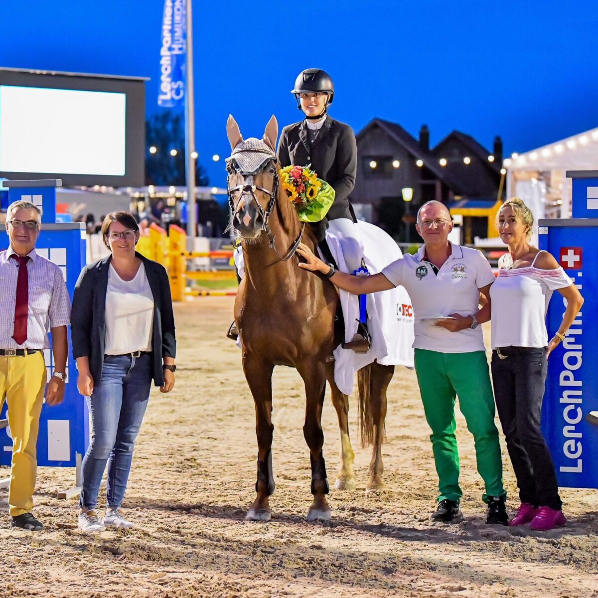 Vor einem Jahr, am ersten nationalen LerchPartner.ch CS Humlikon 2022, nahm die von Melanie Freimüller trainierte Saskia Benz mit ihrer Dunkelfuchsstute Fantasie du Thot zum ersten Mal an einem Knock-Out-Springen teil und erreichte dort die 2. Runde. Heute erreiche sie mit ihrem erst 8-jährigen Pferd den Final und setzte sich in einem hochspannendem Duell gegen die erfahrene Arianne Muff mit Chakka II durch. „Gross antreiben musste ich meinte Stute im Parcours nicht, sie ist so oder so immer sehr schnell“, sagte Saskia Benz, die im rund sechs Kilometer entfernten Thalheim an der Thur wohnt. Sie durfte den Siegerpreis aus den Händen von Alexandra und Ulrich Koller, dem Hauptaktionär und Geschäftsführer vom Titelsponsor, der Lerch&Partner Generalunternehmung AG, Winterthur, entgegen nahmen.