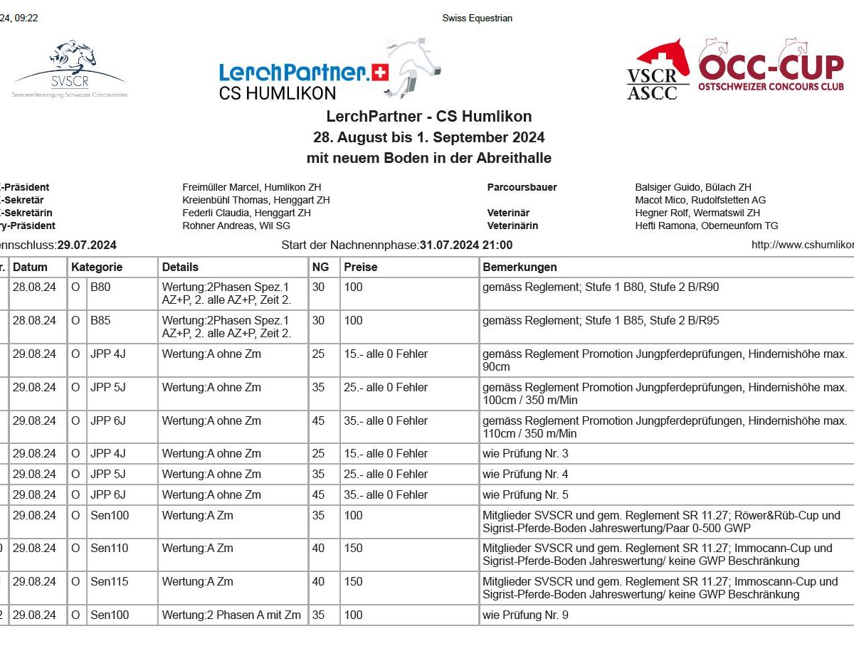 27 Springen an fünf Turniertagen – der LerchPartner.ch CS Humlikon 2024 umfasst ein vielseitiges sportliches Programm. In diesem Jahr beginnt der Concours schon am Mittwochnachmittag mit je einer B80 und einer B85-Prüfung für Kinder, Jugendliche sowie Reiter oder Pferde mit weniger Routine. Am Donnerstag gibt es neben den Jungpferde-Prüfungen auch wieder Startgelegenheiten für Senioren.