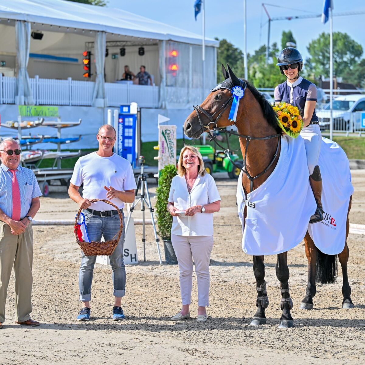 In der ersten Prüfung, dem Preis von Dora Rütimann, Winterthur, setzte Nicole Baumgartner-Müller aus Frauenfeld ihre Erfolgsserie fort – in diesem August siegte sie bereits zwei Mal in Dielsdorf sowie in Hüntwangen. Nun setzte setzte sie sich im Sattel des 14-jährigen Holsteiners PB Quantico fehlerfrei in 59.39 Sekunden an die Spitze des 70-köpfigen Starterfeldes- Mit zwei Zehntelsekunden Rückstand Zweiter wurde der St. Galler Junior Leon Hänzi mit Qui Rit PJ; den 3.Rang holte sich Christoph Könemann, Steinhausen, mit Tina Pols Kamilla D vor Tamara Schnyder, Thalheim an der Thur, mit Quinsten TS und Raphael Jud, Dotnacht, mit Jyllena M.